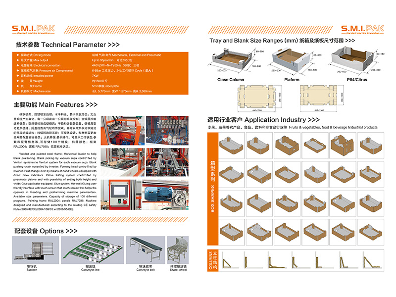 Speed: 35 trays/minute (Trays with reinforced corner posts).產(chǎn)量:35只/分;(立柱形開口箱)